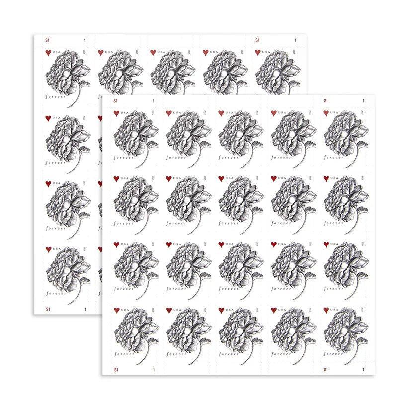 In 2015, the U.S. Postal Service issued Vintage Rose, a Forever stamp. This all-occasion stamp can be used for wedding RSVP cards and thank you notes, Mother’s and Father’s Day cards, Valentine’s Day cards, birthday cards, sympathy cards, thinking-of-you cards — for all occasions when a beautiful stamp is fitting. The stamp art features an elaborate floral line drawing of a rose similar to the design of the 2015 two-ounce Vintage Tulip stamp. Jeanne Greco designed these stamps using drawings from engraved plates originally created by naturalist artist Maria Sibylla Merian (1647–1717). A small, deep crimson heart on both stamps adds a dash of color to the designs and makes them a natural pair. These stamps were printed using the intaglio printing technique. Vintage Rose and Vintage Tulipare the latest additions to the Weddings series. Greg Breeding was the art director.